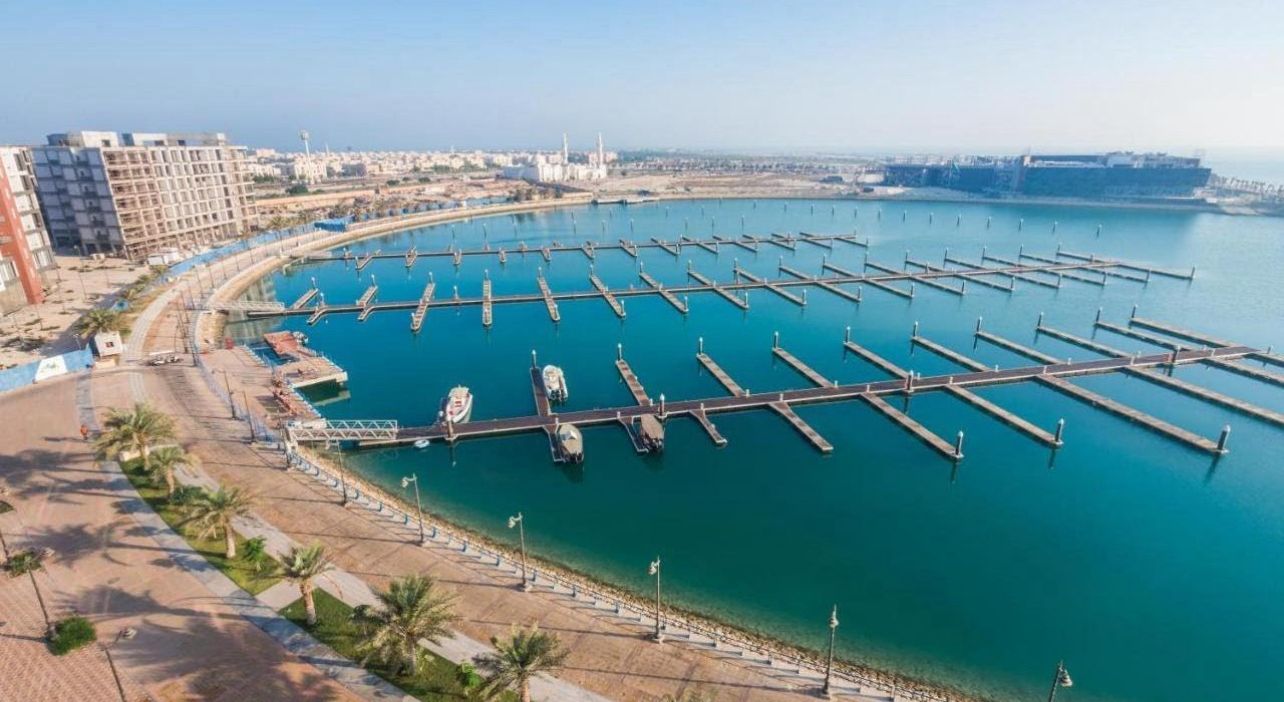 • تظهر واجهة الجبيل بمزيج يجمع بين المنشآت الصناعية الحديثة والمباني السكنية.