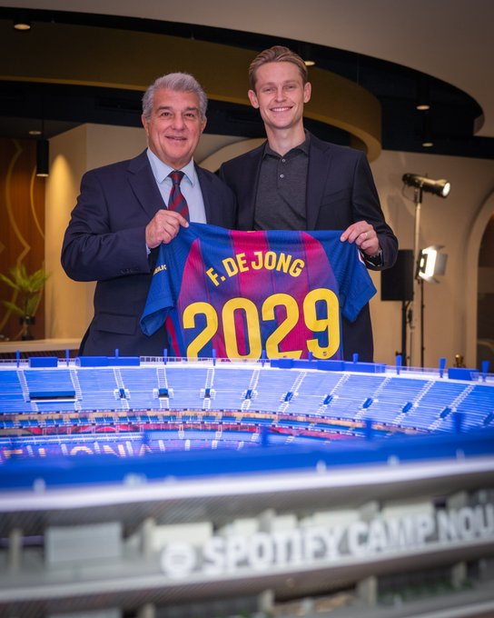 وذكر برشلونة على موقعه الإلكتروني :” مدد لاعب خط الوسط فرينكي دي يونج تعاقده مع برشلونة حتى 2029 ، حيث قام اللاعب الهولندي، اليوم الأربعاء، بالتوقيع على عقده الجديد بحضور الرئيس خوان لابورتا”.