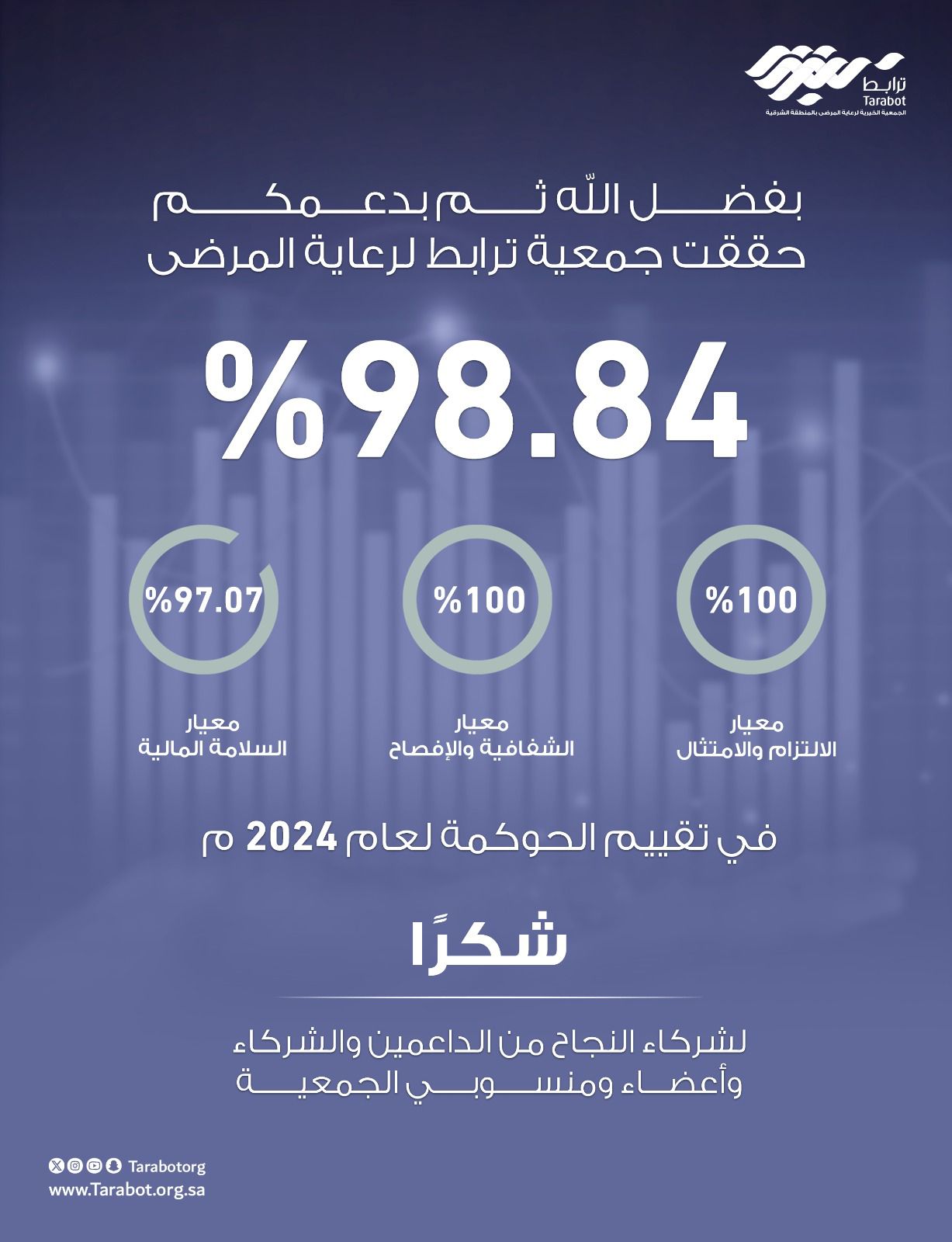حققت جمعية ترابط لرعاية المرضى نسبة 98,84% في مؤشرات الحوكمة الصادرة عن المركز الوطني لتنمية القطاع غير الربحي لعام 2024م.