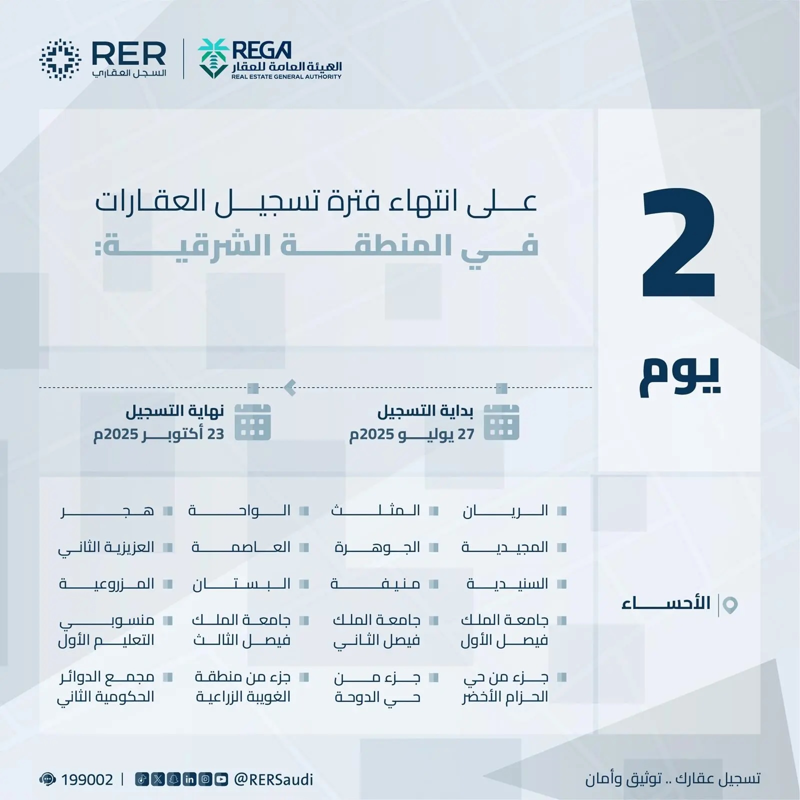 أعلنت الهيئة العامة للعقار عن قرب انتهاء المهلة المحددة للتسجيل العيني الأول للعقار لـ 14878 قطعة عقارية في محافظة الأحساء بالمنطقة الشرقية بنهاية يوم الخميس 1 جمادى الأول 1447هــ، الموافق 23 أكتوبر 2025م.