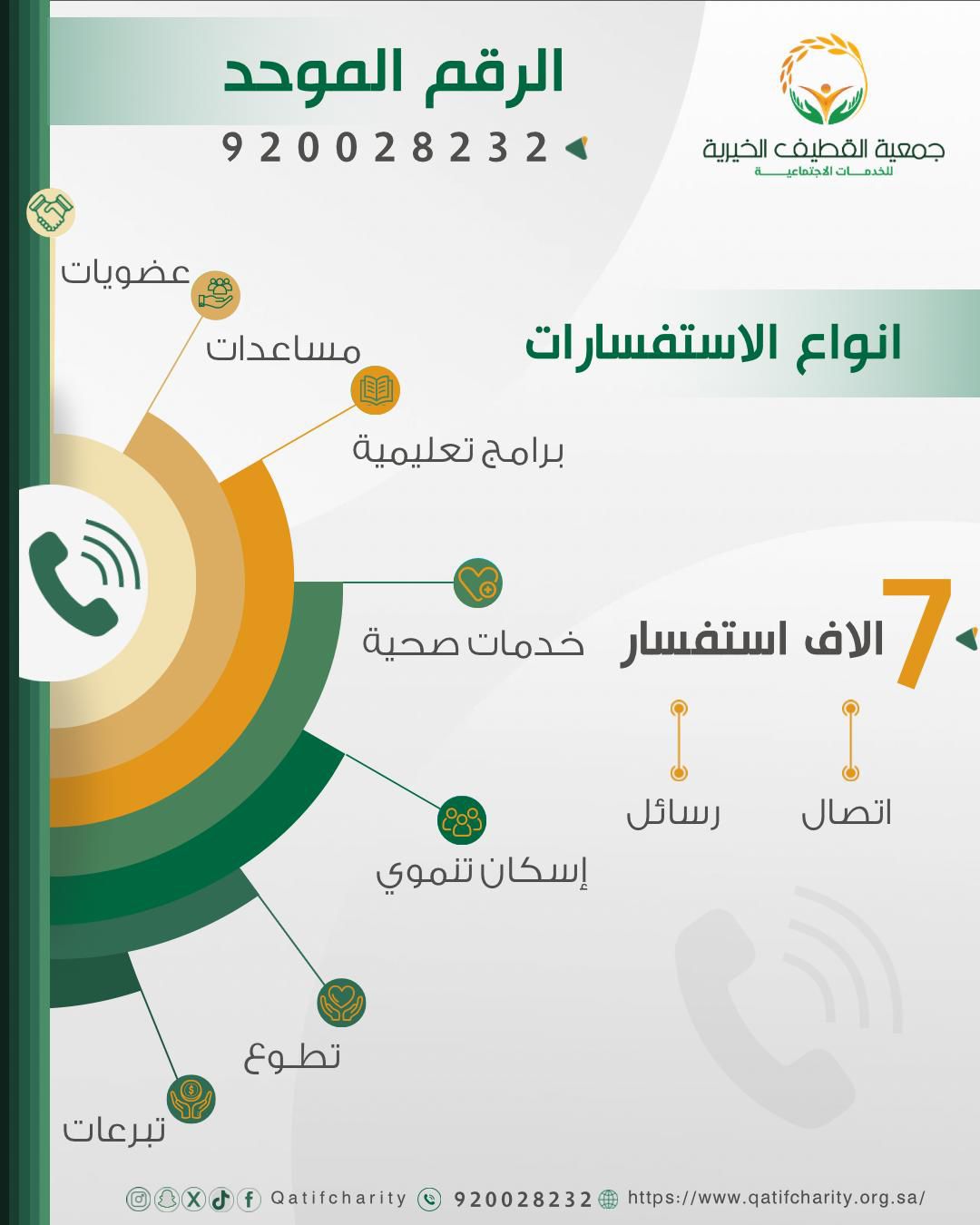 استقبل الرقم الموحد لجمعية القطيف الخيرية (920028232) والذي يعتبر أحدث وسائل التواصل التي اطلقتها الجمعية أكثر من 7 آلاف استفسار مند اطلاقه أواخر عام 2024 لتعزيز التواصل مع مستفيدي وداعمي الجمعية، والجمهور العام.