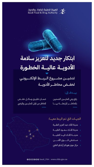 وشملت الجهات التي تم الربط معها مدينة الملك فهد الطبية، ومدينة الملك سعود الطبية، ومستشفى قوى الأمن، ومدينة الملك عبدالعزيز الطبية، ومركز جونز هوبكنز أرامكو الطبي، وساهم هذا الربط في منح المستشفيات فرصة المشاركة لتعزيز سلامة أدوية المرضى من خلال إيصال وسائل خفض المخاطر بشكل مباشر وفعال، مما يجعلها في مقدمة المنشآت الصحية الملتزمة بتطبيق أفضل الممارسات في الاستخدام الآمن للأدوية.