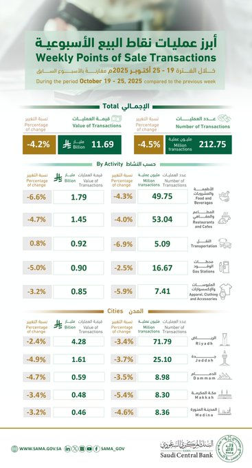 بلغت قيمة المبيعات عبر نقاط البيع في المملكة، 11.69 مليارات ريال في الأسبوع الماضي خلال الفترة من 19 أكتوبر حتى 25 أكتوبر 2025.