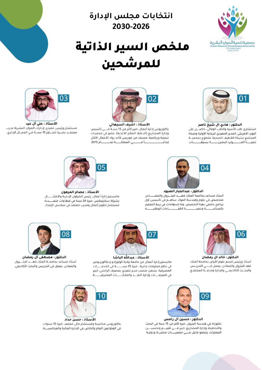 بأن عدد المتقدمين للترشح عشرة أشخاص من ذوي الكفاءة العلمية والعملية من أبناء مجتمعنا يُختار منهم خمسة أشخاص يمثلون مجلس الإدارة المنتخب للاربع سنوات القادمة ليتخاروا لاحقا الرئيس بينهم وتوزيع المهام الإدارية بين الاعضاء .