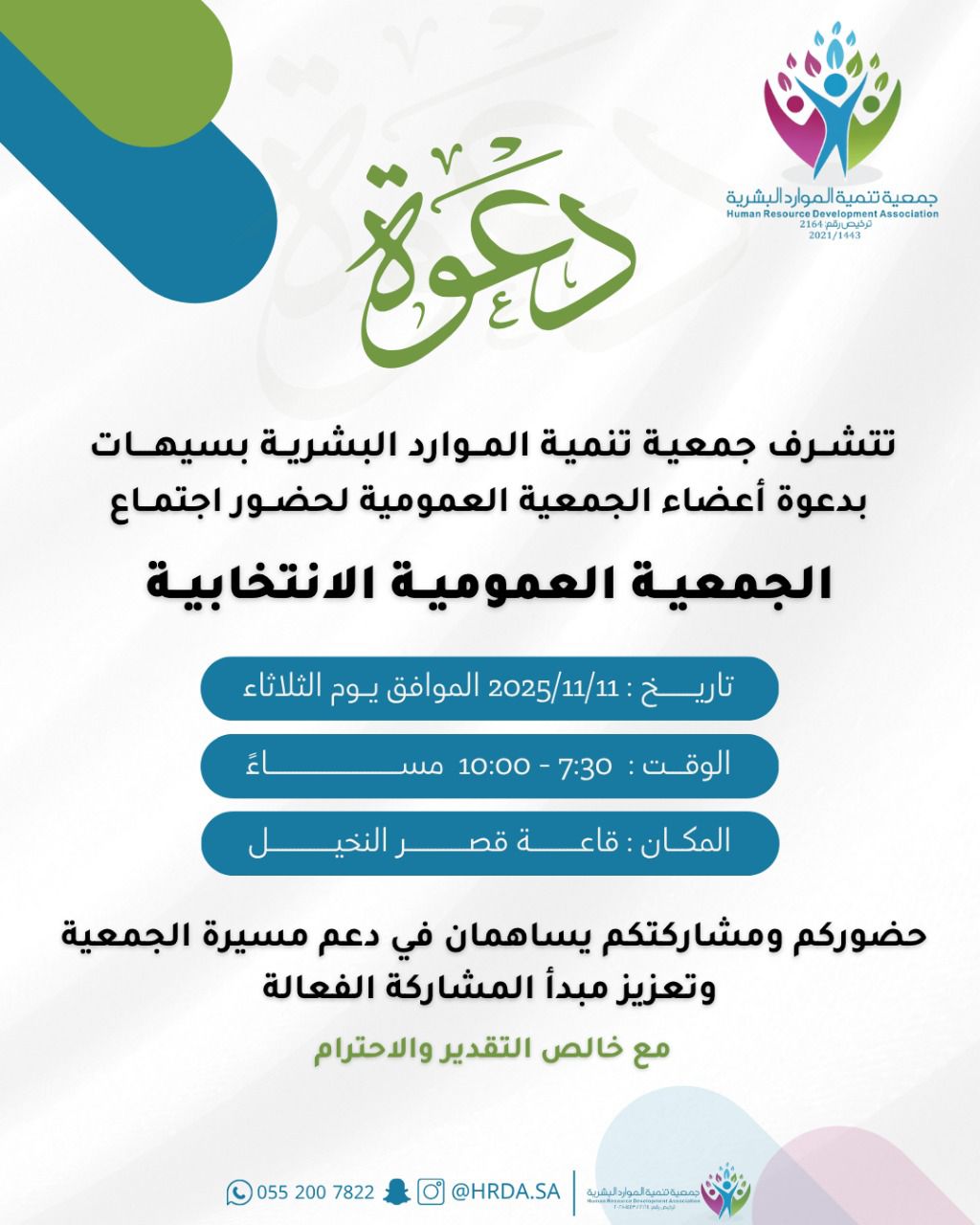 وجهت جمعية تنمية الموارد البشرية بسيهات الدعوة لاعضاء جمعيتها العمومية لحضور اجتماع الجمعية العمومية الانتخابية المقرر عقده مساء يوم الثلاثاء ١١/١١/٢٠٢٥م بقاعة قصر النخيل من الساعة ٧.٣٠ م حتى ١٠ م .