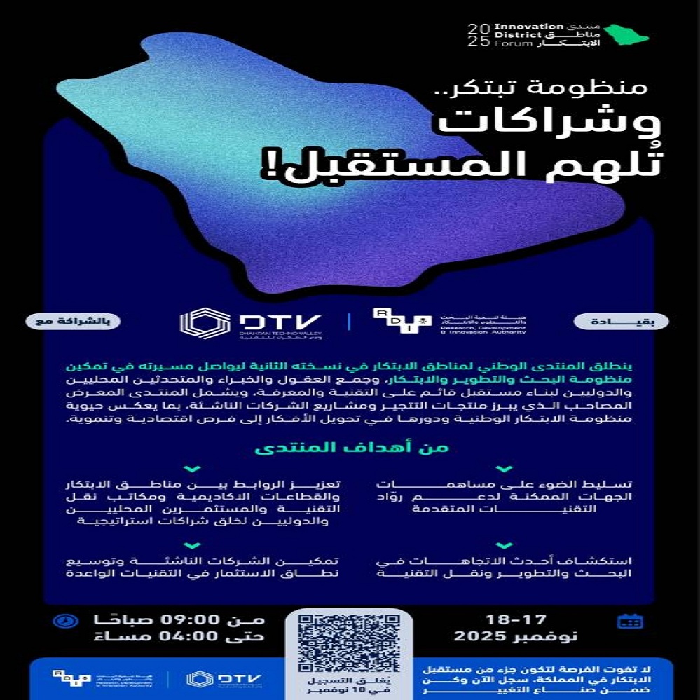 أعلنت هيئة تنمية البحث والتطوير والابتكار عن فتح باب التسجيل للمشاركة في النسخة الثانية من منتدى مناطق الابتكار2025، الذي تنظمه الهيئة بالشراكة مع وادي الظهران للتقنية يومَي 17 و18 من نوفمبر الجاري، ضمن جهودها الرامية إلى تعزيز منظومة البحث والابتكار، ودعم مستهدفات رؤية المملكة 2030 في بناء اقتصاد معرفي مزدهر.