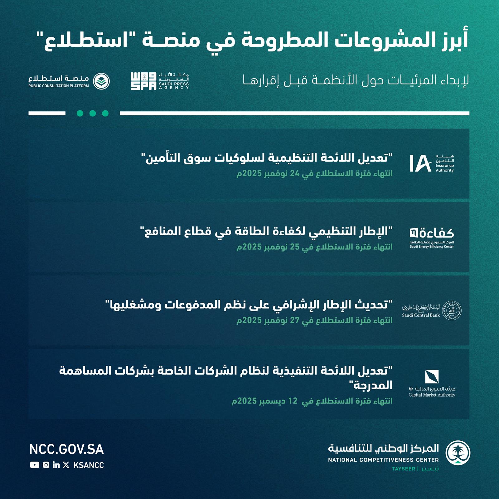 من جانبه طرح المركز السعودي لكفاءة الطاقة عبر المنصة مشروع (الإطار التنظيمي لكفاءة الطاقة في قطاع المنافع)؛ بهدف وضع إطار تنظيمي لكفاءة الطاقة في قطاع المنافع يشمل متطلبات ومستهدفات كفاءة الطاقة على المحطات القائمة والجديدة لتوليد الكهرباء والإنتاج المزدوج وتحلية مياه البحر, إضافة إلى شبكات نقل وتوزيع الكهرباء، وينتهي الاستطلاع على المشروع بتاريخ 25 نوفمبر 2025م.