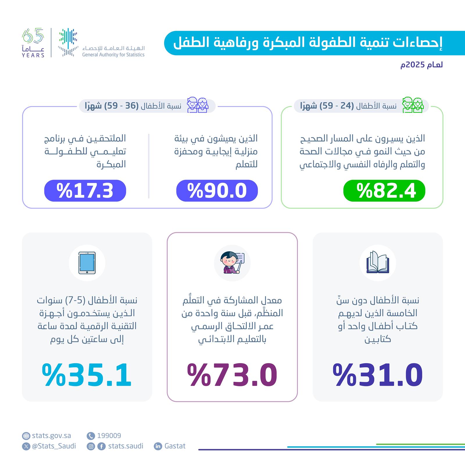 أصدرت الهيئة العامة للإحصاء نتائج إحصاءات تنمية الطفولة المبكرة ورفاهية الطفل لعام 2025م، التي أظهرت أن 82.4% من الأطفال في الفئة العمرية (24-59 شهرًا) يسيرون على المسار الصحيح في مجالات الصحة، والتعلُّم، والرفاه النفسي والاجتماعي، وفقًا لمؤشر تنمية الطفولة المبكرة (ECDI2030).