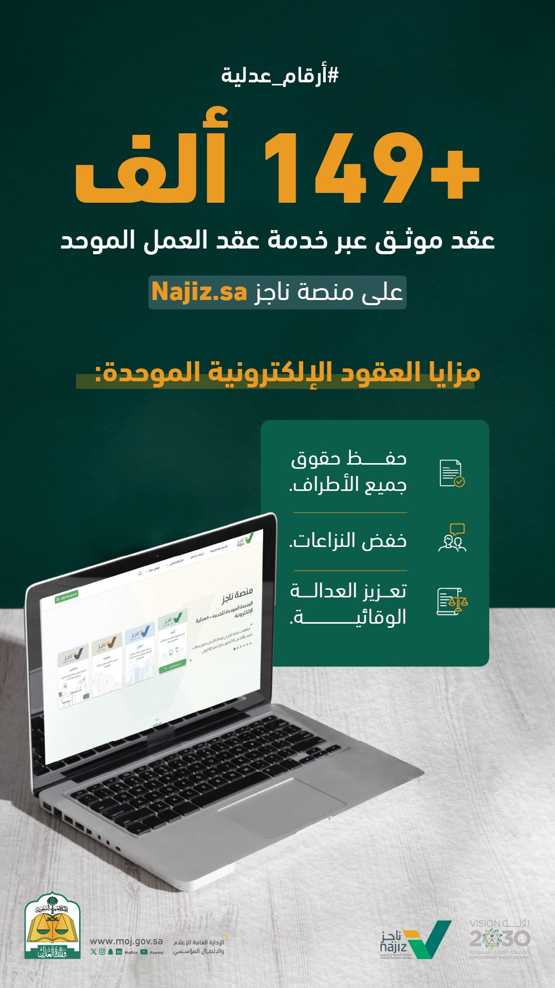 كشفت وزارة العدل عن توثيق ما يزيد عن 149 ألف عقد عبر خدمة عقد العمل الموحد على منصة ناجز، في خطوة تعكس تنامي الاعتماد على الخدمات العدلية الرقمية وسهولة الوصول إليها من قبل المستفيدين.