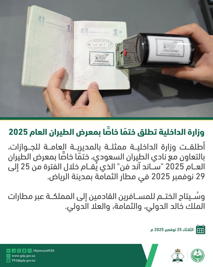 أطلقت وزارة الداخلية ممثلة بالمديرية العامة للجوازات، بالتعاون مع نادي الطيران السعودي، ختمًا خاصًّا بمعرض الطيران العام 2025 “ساند آند فن” الذي يُقام خلال الفترة من 25 إلى 29 نوفمبر 2025 في مطار الثمامة بمدينة الرياض.