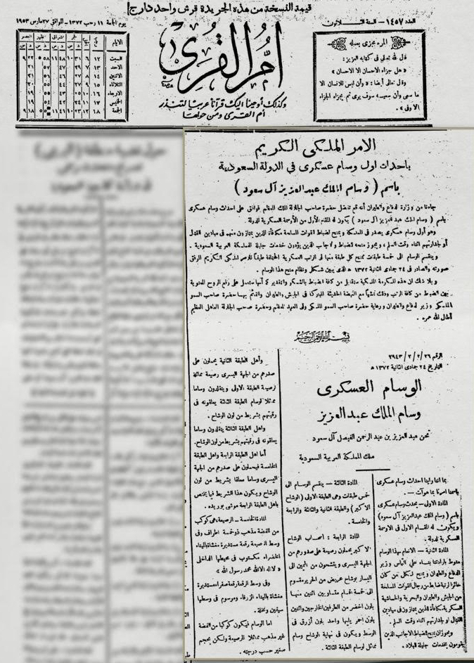 وأبرزت أم القرى في ذلك الوقت تفاصيل القرار وما يحمله من دلالات، مؤكدة أنه يمثل نقلة نوعية في بنية التنظيم العسكري بالمملكة كما شكّل هذا الوسام لاحقًا أساسًا لمنظومة واسعة من الأوسمة المدنية والعسكرية التي تبنتها الدولة .