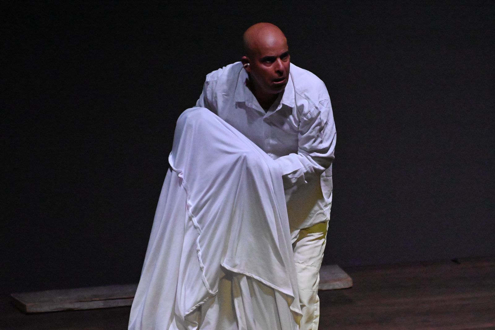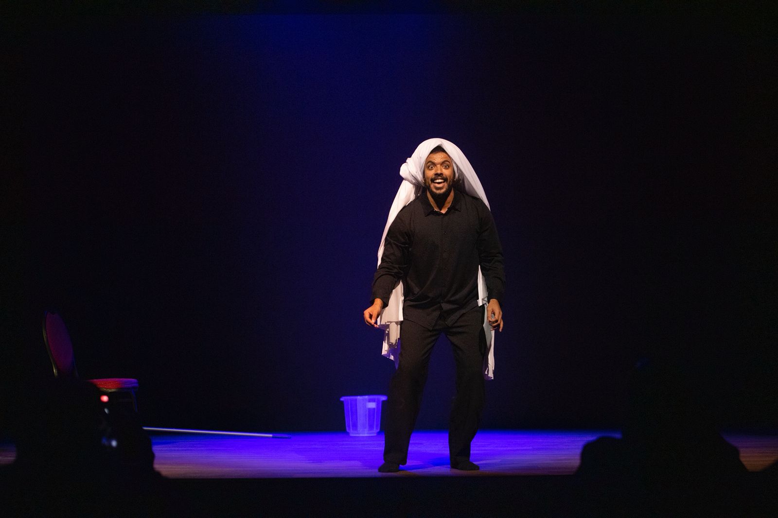 وقد بدأ الافتتاح بالسلام الملكي، ثم عرض مرئي يتناول ممثل واحد يجسد المسرح يعيش الحكاية ويحمل الرسالة كاملة، من اخراج نوح الجمعان وتمثيل شهاب الشهاب، الذي تعامل مع العرض بوصفه تحديًا جميلًا؛ حيث جسد ست شخصيات في جسد “القيادة”، واعتبر الممثل، الذي هو محور العمل وقائد مركزه، مشاركته شرفًا ومسؤولية، وصعد الخشبة ليعيش الانتقال بين ست شخصيات متناقضة، لكل منها صوتها وجسدها وحالتها الخاصة.