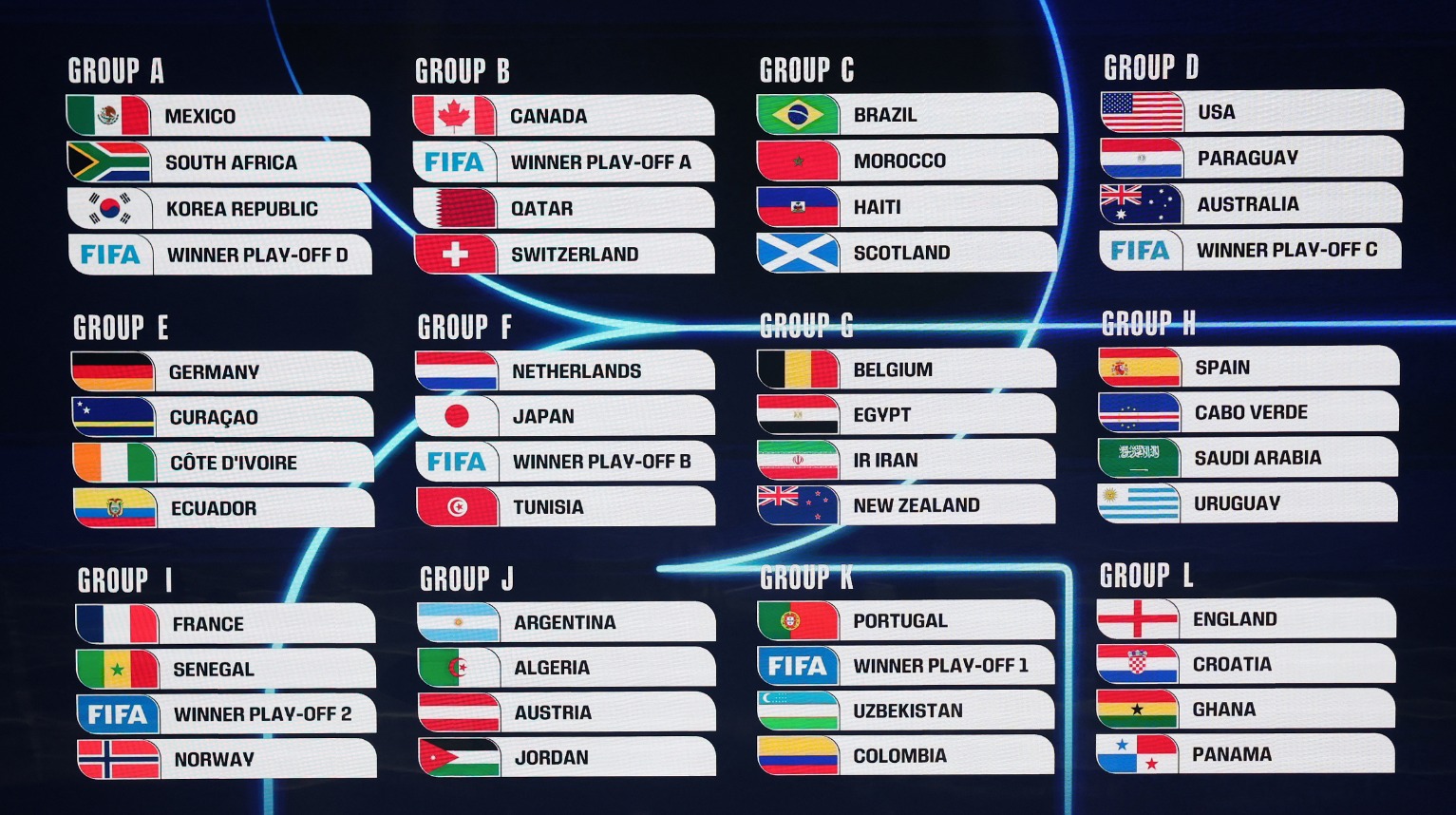 وتم توزيع المنتخبات الـ48 المشاركة في المونديال خلال القرعة على 4 مجموعات، بواقع 4 منتخبات في كل مجموعة، حيث تم وضع منتخب واحد من كل مستوى في كل مجموعة، علما بأنه لا يمكن وضع منتخبين من نفس الاتحاد القاري في مجموعة واحدة، باستثناء الاتحاد الأوروبي لكرة القدم (يويفا)، الذي يمثله 16 منتخبا في هذا العرس العالمي الكبير.