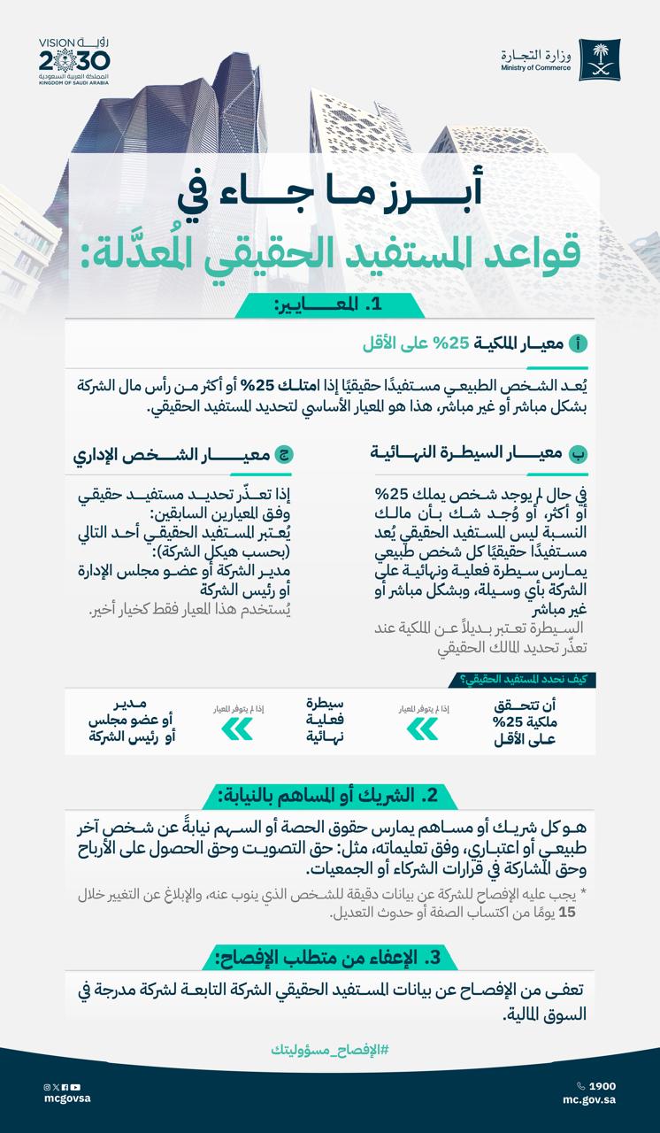 صدر قرار معالي وزير التجارة الدكتور ماجد بن عبدالله القصبي رقم (99) وتاريخ 1447/06/05هـ، بالموافقة على قواعد المستفيد الحقيقي، وعرّفت القواعد المستفيد الحقيقي بأنه الشخص -أو الأشخاص ذوو الصفة الطبيعية- الذي يمتلك سيطرة فعلية نهائية مباشرة أو غير مباشرة على الشركة.