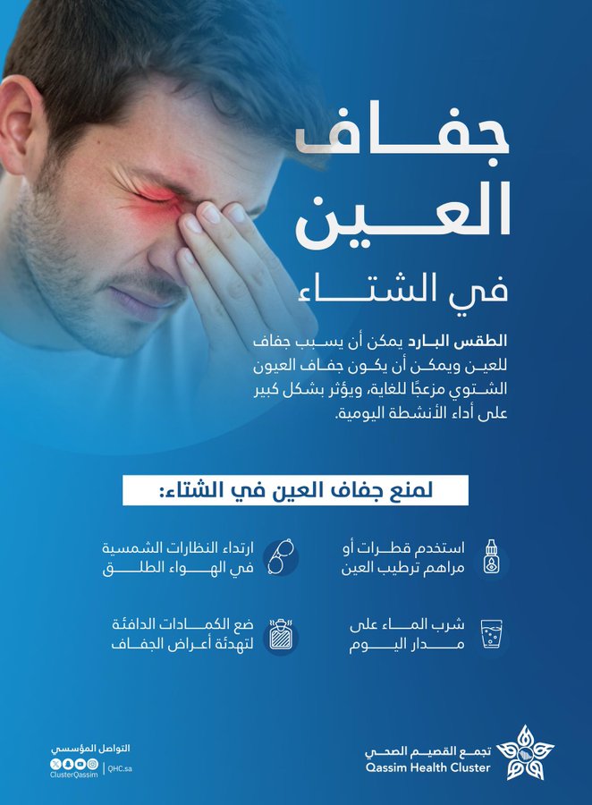 وقال تجمع القصيم الصحي في إنفوجراف توضيحي نشره عبر حسابه الرسمي على منصة “إكس” إنه يمكن الوقاية من جفاف العين خلال فصل الشتاء من خلال اتباع الآتي: