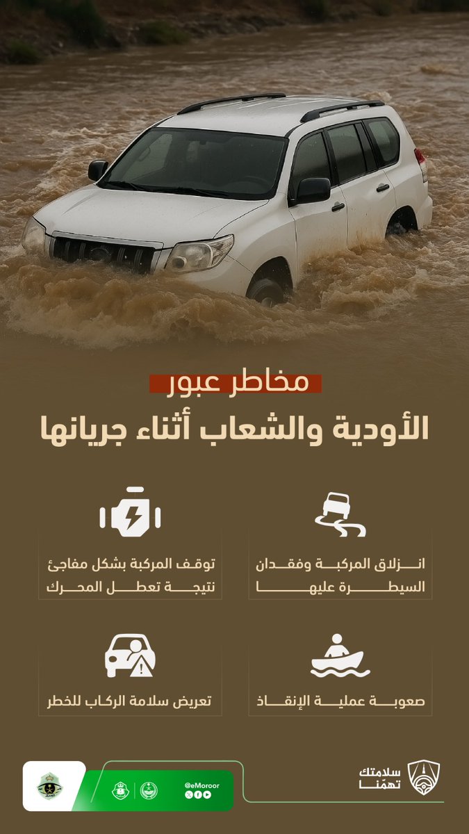 أوضحت الإدارة العامة للمرور مخاطر عبور الأودية والشعاب أثناء جريانها، مبيّنة إنه يسبب انزلاق المركبة وفقدان السيطرة عليها.