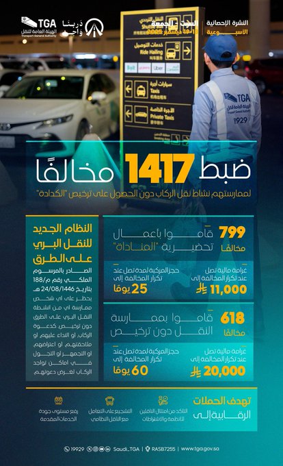 وأشارت الهيئة إلى أن النظام الجديد للنقل البري الجديد على الطرق، الصادر بالمرسوم الملكي رقم (م/188) وتاريخ (1446/08/24هـ)، شدد على منع ممارسة النقل دون ترخيص نظامي، ونصت العقوبات عند تكرار المخالفات على غرامات مالية تصل إلى (11) ألف ريال مع حجز المركبة لمدة (25) يومًا بحق من يقوم بالأعمال التحضيرية “المناداة”، فيما تصل العقوبات إلى غرامة قدرها (20) ألف ريال وحجز المركبة لمدة تصل إلى (60) يومًا بحق من يزاول النقل غير النظامي، مع إمكانية بيع المركبة المخالفة في مزاد علني وإبعاد غير السعودي في حال تكرار المخالفة.