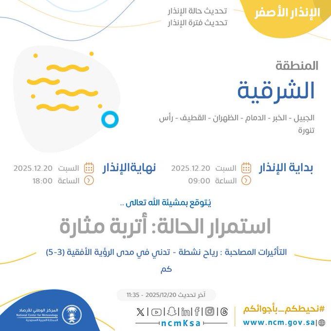 وأضاف المركز، عبر منصة (إكس) أن «هذه الحالة تشمل «الجبيل، الخبر، الدمام، الظهران، القطيف، رأس تنورة»، وتستمر حتى الساعة السادسة مساء».