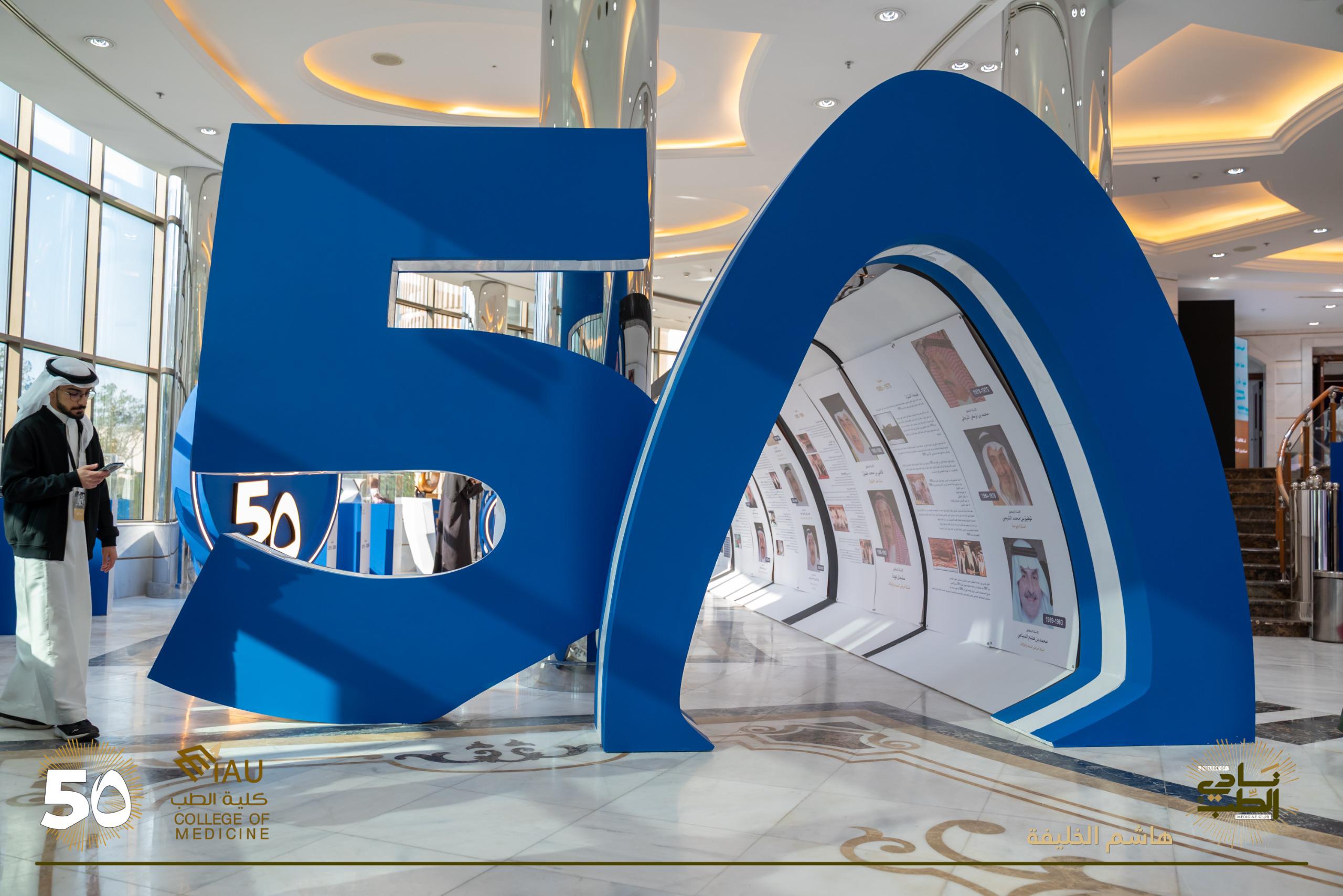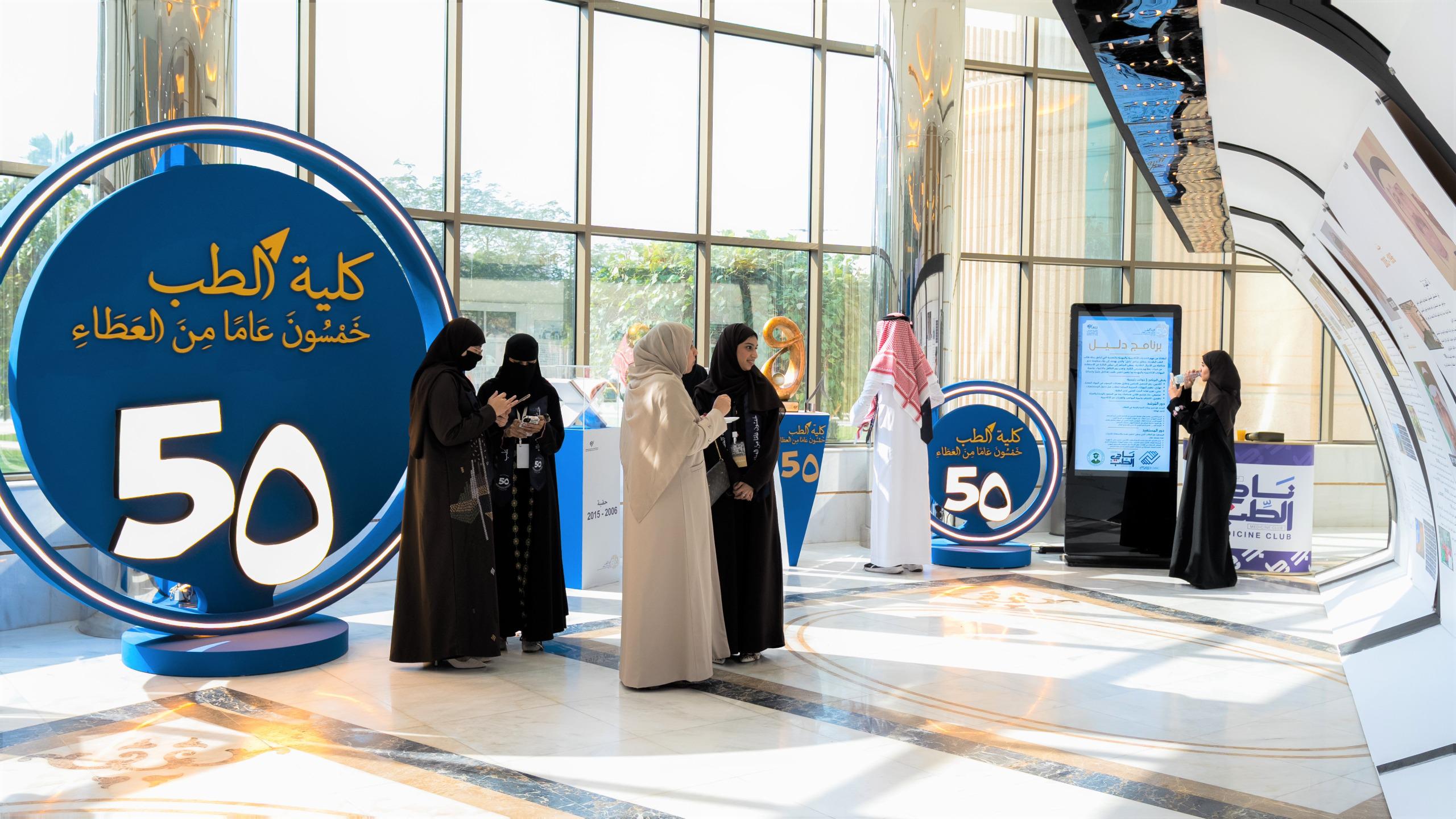 الى جانب ذلك افتتح رئيس الجامعة المعرض المصاحب للاحتفال، والذي حمل عنوان «رحلة نصف قرن» ، مستعرضًا المحطات الزمنية لمسيرة الكلية منذ تأسيسها وحتى اليوم، من خلال خطٍ زمنيٍّ لعمداء الكلية، وأرشيفٍ وثّق ملامح الحياة الأكاديمية، والمناسبات والفعاليات، واحتفالات التخرج التي شكّلت ذاكرةً جمعية لأجيالٍ متعاقبة ، وتضمّن برنامج الحفل استعراضًا لتاريخ تأسيس الكلية ومسيرة خريجيها، إلى جانب أوبريت غنائي وفيلم تعريفي وثّق مسيرتها العلمية والإنسانية، إضافةً إلى عرض مرئي بعنوان «رحلتي في كلية الطب»، ومشاركات مصوّرة لخريجين سابقين استعادوا فيها ذكرياتهم وتجاربهم، تلا ذلك جلسة حوارية جمعت الماضي بالحاضر، واختُتم الحفل بتكريم عددٍ من الشخصيات والروّاد .