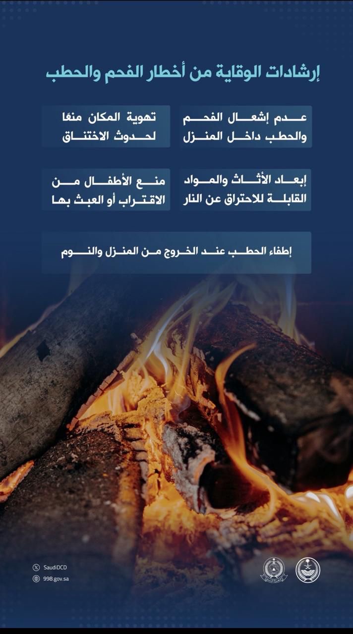 دعت المديرية العامة للدفاع المدني إلى التقيّد بإرشادات الوقاية من أخطار الفحم والحطب، وذلك بعدم إشعالهما داخل المنزل، وتهوية المكان، ومنع الأطفال من الاقتراب أو العبث بهما، وإطفائهما عند الخروج وقبل النوم، وإبعاد المواد القابلة للاحتراق.