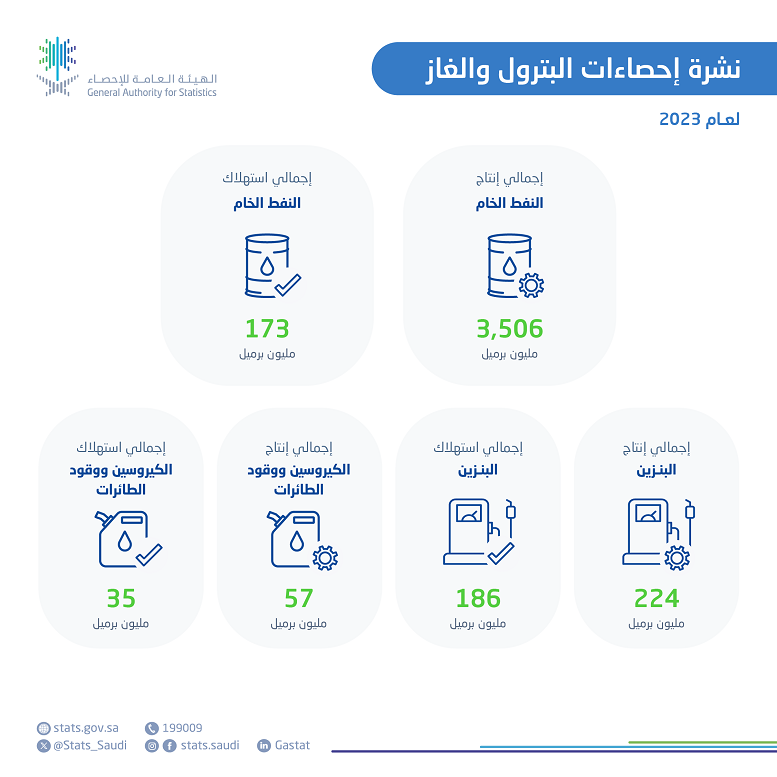 أعلنت الهيئة العامة للإحصاء اليوم نتائج نشرة إحصاءات البترول والغاز في المملكة العربية السعودية لعام 2023م، ووفقاً لنتائج النشرة فقد شهد إجمالي إنتاج النفط الخام في المملكة لعام 2023 انخفاضاً بنسبة 9,3 % مقارنة بعام 2022 م ، حيث بلغ 3,506 مليون برميل ، في حين شهدت كمية صادرات النفط الخام انخفاضًا بنسبة 9.6% حيث بلغت كمية الصادرات من النفط 2,431 مليون برميل مقارنة بعام 2022.