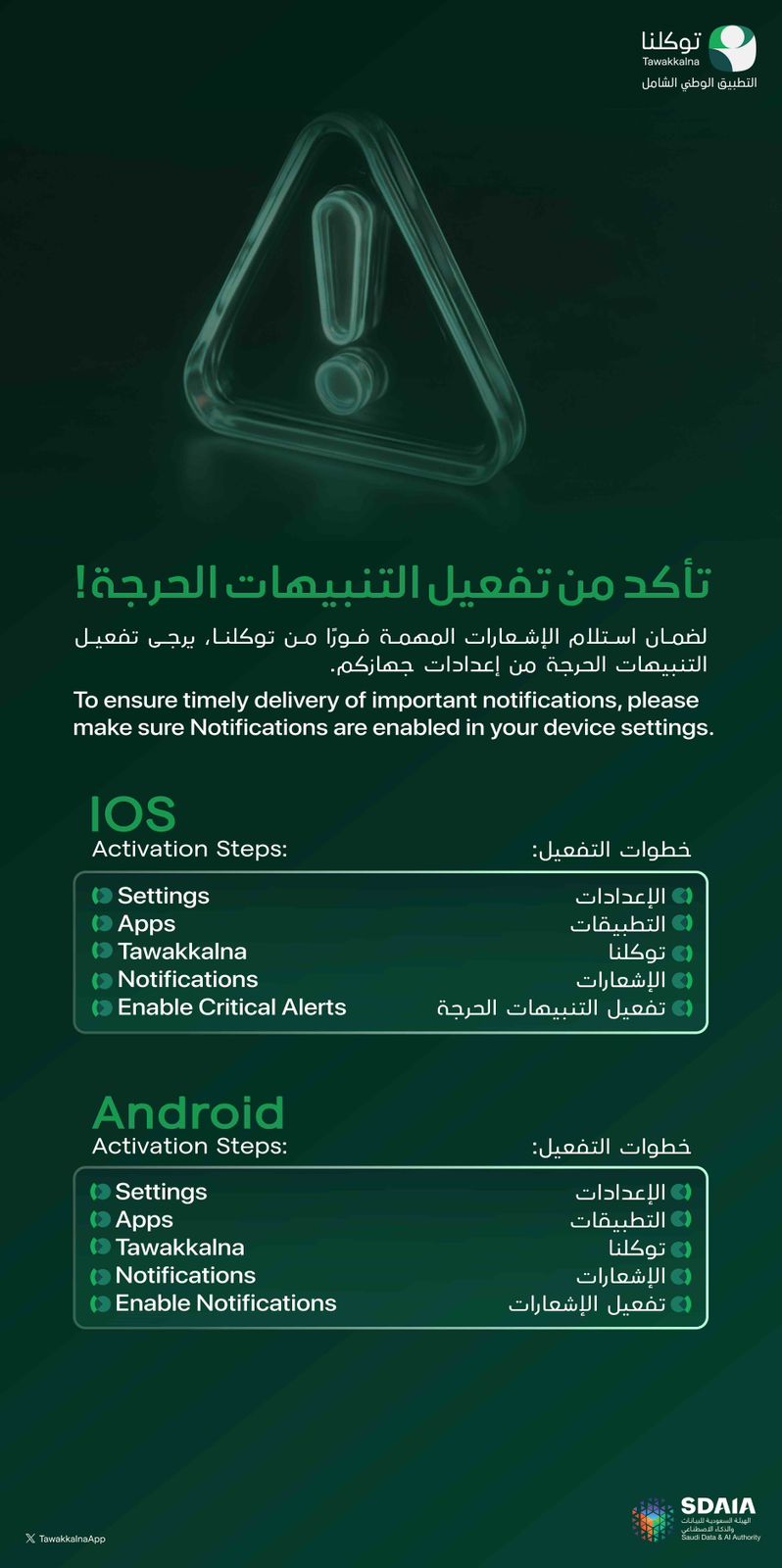 وبيّن أن خطوات التفعيل على أجهزة iOS تتم عبر الدخول إلى “الإعدادات”، ثم “التطبيقات”، واختيار “توكلنا”، وبعدها “الإشعارات”، وتفعيل خيار “التنبيهات الحرجة”، أما على أجهزة Android، فيتم الدخول إلى “الإعدادات”، ثم “التطبيقات”، واختيار “توكلنا”، ثم “الإشعارات”، مع التأكد من تفعيل الإشعارات بشكل كامل.