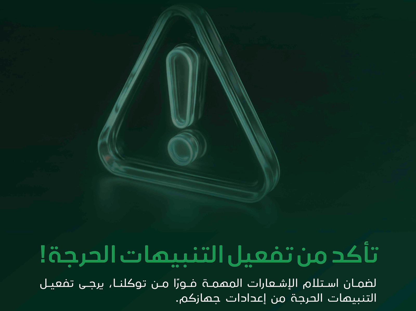 دعا تطبيق توكلنا المستخدمين إلى ضرورة تفعيل خاصية التنبيهات الحرجة، لضمان استلام الإشعارات والتحديثات المهمة بشكل فوري دون تأخير.