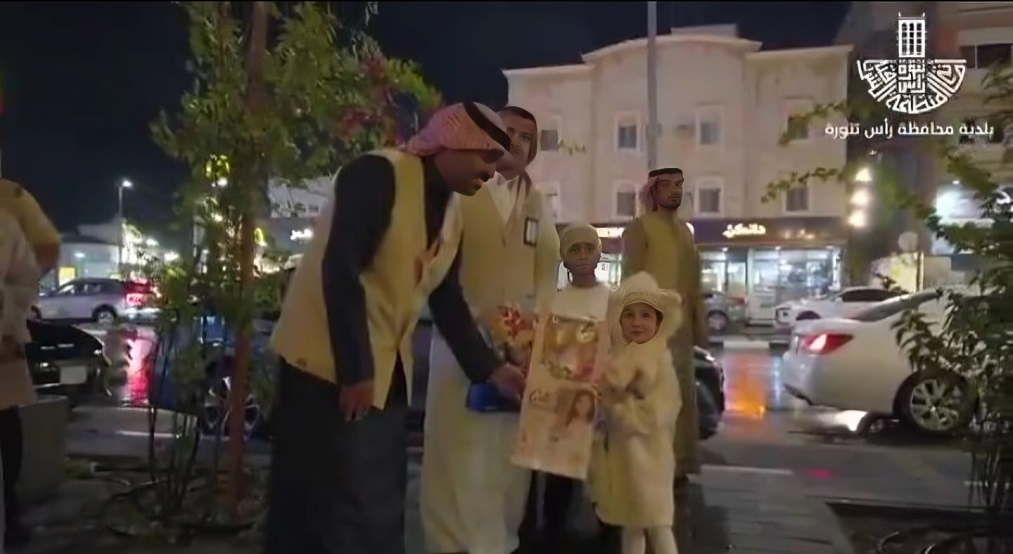 بالحلوى والهدايا.. بالفيديو: بلدية رأس تنورة تشارك الأهالي فرحة القرقيعان