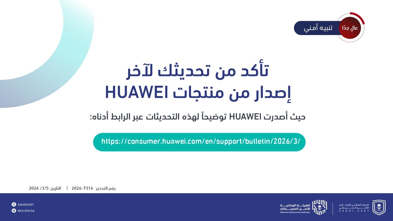 أصدر المركز الوطني الإرشادي للأمن السيبراني تحذيرًا أمنيًا عالي الخطورة بشأن وجود ثغرات أمنية في عدد من منتجات شركة Huawei، داعيًا المستخدمين والجهات المختلفة إلى المبادرة بإجراء التحديثات الأمنية اللازمة.