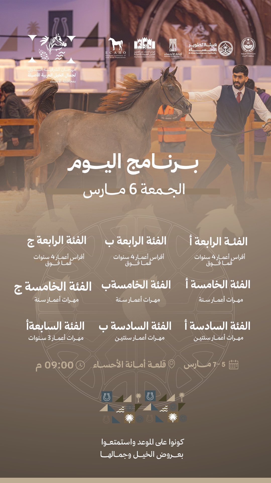 وأقيمت المنافسات في قلعة أمانة الأحساء خلال الفترة من 5 إلى 7 مارس، حيث تنافس المشاركون في عدة فئات وفق معايير دقيقة تعتمد على جمال الخيل وتناسقها وأدائها أثناء العرض، ما أضفى أجواء من الحماس والتشويق بين المشاركين والحضور.