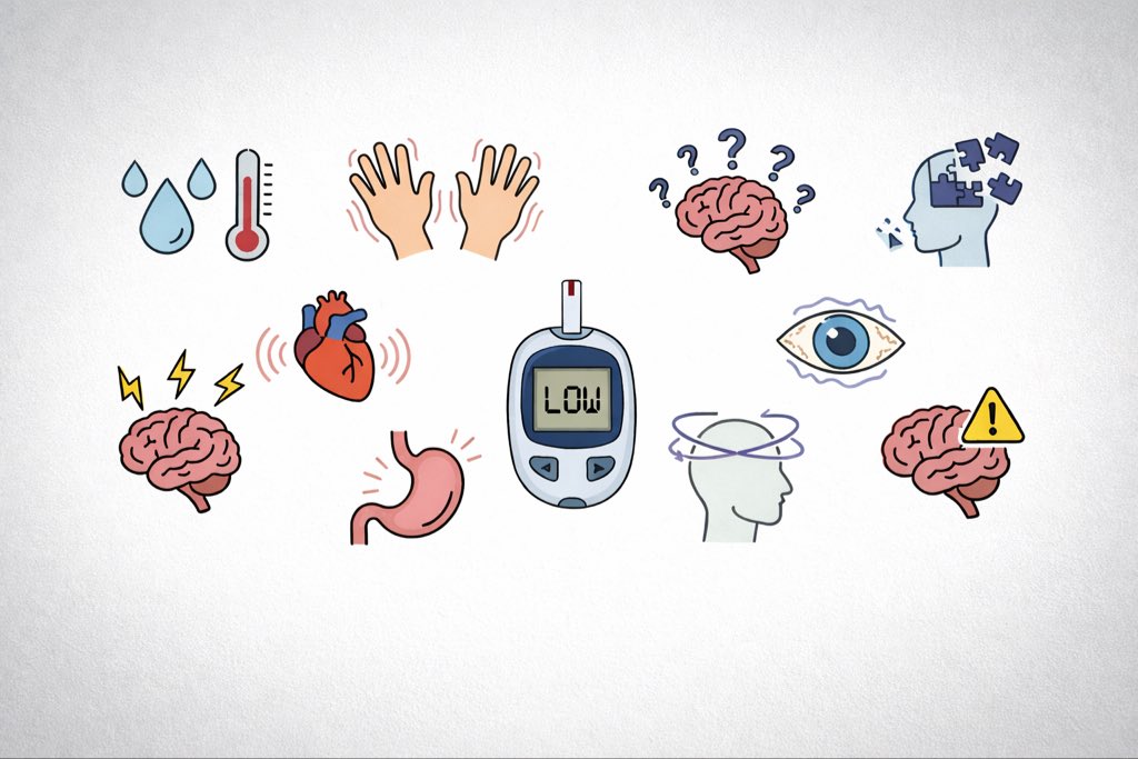 وأشار إلى أن هناك أعراض متقدمة تنتج عن نقص السكر في الدماغ، مثل: تشوش أو صعوبة التركيز، زغللة في النظر، الدوخة، التشنجات، وفقدان الوعي. وبيّن أن ظهور هذه الأعراض يعني أن انخفاض السكر أصبح خطيرًا ويحتاج إلى تدخل فوري.
