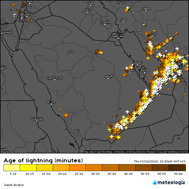 وأضاف المسند عبر حسابه بمنصة إكس أن هذه العواصف مصحوبة بـ “عقد متلألئ” من البروق يمتد من جنوب غرب الربع الخالي مرورًا بالإمارات ومضيق هرمز ووصولًا إلى غرب إيران، بطول يصل إلى نحو 1600 كيلومتر.