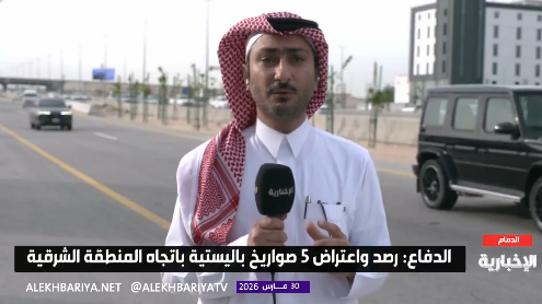 وقال مراسل قناة الإخبارية خالد الجناحي إن الهدوء يسود المنطقة الشرقية، مع حركة سير طبيعية، وذلك بعد اعتراض الدفاعات الجوية 5 صواريخ في سماء المنطقة، وسط حالة من الثقة والطمأنينة لدى المواطنين.