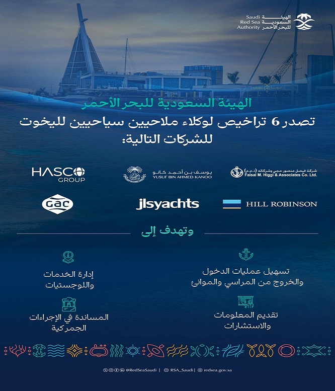 أصدرت الهيئة السعودية للبحر الأحمر خلال العام الحالي 2024 , أول 6 تراخيص لوكلاء ملاحيين سياحيين لليخوت في المملكة، ضمن خطواتها المتسارعة لبناء قطاع سياحي ساحلي مزدهر، يعكس التزامها بتنظيم الأنشطة الملاحية والبحرية السياحية، وتهيئة البيئة الملائمة للسياح والمستثمرين والممارسين في البحر الأحمر كوجهة سياحية عالمية ضمن رؤية المملكة 2030.