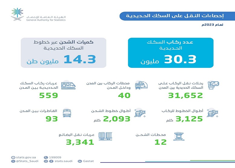 النشرة فقد أظهرت ارتفاع عدد ركاب السكك الحديدية بنسبة 33% مقارنة بعام 2022 ، حيث بلغ نسبة الركاب داخل المدن 72.5 % ، قطعوا من خلالها مسافة أكثر من مليون كيلومتر بينما بلغت نسبة الركاب بين المدن 27.5% من إجمالي عدد الركاب في عام 2023م عبر 31.7 ألف رحلة، قطعوا من خلالها مسافة 10.4 مليون كيلومتر.