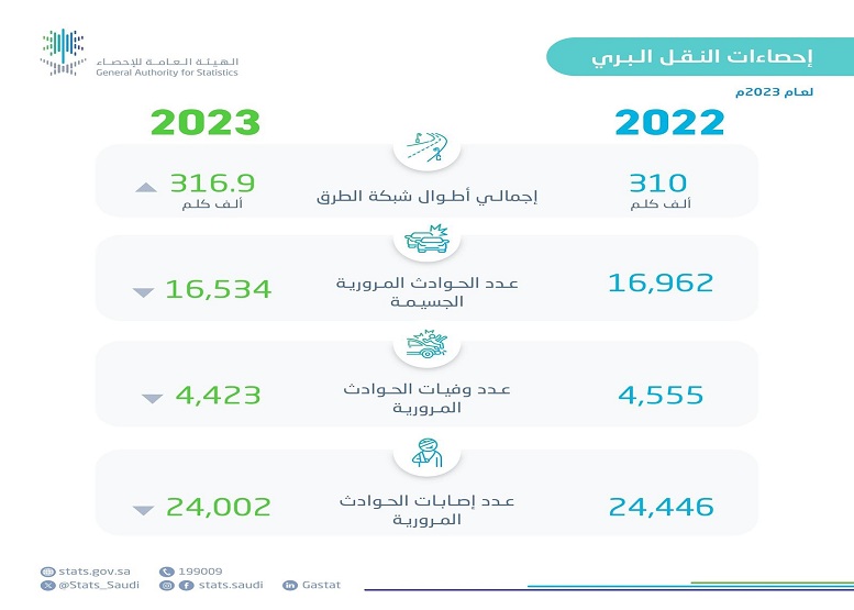 كما أظهرت إحصاءات النقل البري انخفاض الحوادث المرورية الجسيمة في عام 2023م بنسبة %2.5% عن عام 2022م، وأوضحت انخفاض عدد الوفيات بسبب الحوادث المرورية بنسبة 2.9% عن العام السابق، كذلك كشفت نتائج النشرة انخفاض عدد الإصابات من الحوادث المرورية بنسبة 1.8% عن عام 2022، مشيرةً إلى أن نسبة الوفيات بسبب الحوادث المرورية كانت في الفئة العمرية (18 – 30) سنة هي الأعلى بنسبة 35%، تلتها الفئة العمرية (31 – 40) سنة بنسبة 22%.