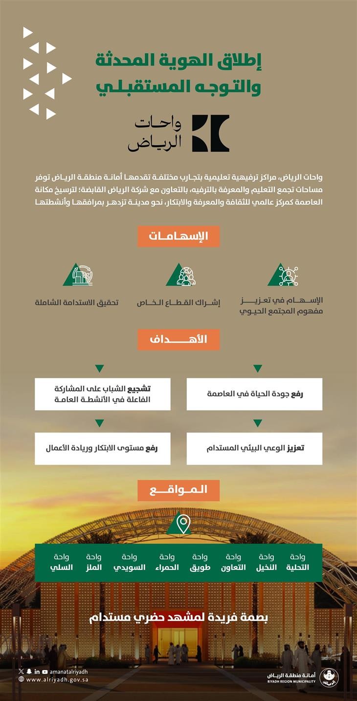 أطلقت أمانة منطقة الرياض هوية واحات الرياض وتوجهاتها المستقبلية وفق منهجية تشغيلية، ونظام مؤسسي يكفل للواحات التميز والريادة في أداء أعمالها، وتحقيق أهدافها، إذ تعد الواحات مركزًا تعليميًا ترفيهيًا يقدم العلوم الأساسية لجميع قطاعات المجتمع ويحفز الإبداع ويعزز ريادة الأعمال في تطبيق العلوم ويقوم على مبدأ الشراكات مع الجهات المختلفة لإيجاد نماذج عملية متطورة.