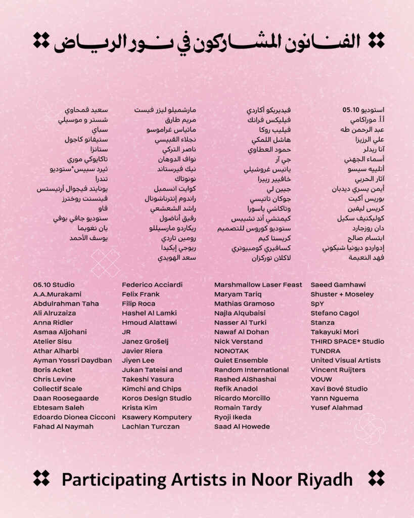 يضم احتفال “نور الرياض” مجموعة متنوعة من الأعمال الفنية الجديدة والتفاعلية التي تبرز إبداع 18 فنانًا سعودياً بارزًا مثل عبد الرحمن طه، آثار الحربي، يوسف الأحمد، ناصر التركي، سعد الهويدي، ومريم طارق، إلى جانب 43 فنانًا دوليًا من أستراليا، فرنسا، إيطاليا، اليابان، هولندا، بولندا، كوريا الجنوبية، إسبانيا، المملكة المتحدة، الإمارات العربية المتحدة، والولايات المتحدة الأمريكية ومن بين هؤلاء يشارك فنانون مثل جوكان تاتيسي، تاكاشي ياسورا، كيمتشي آند تشيبس، لاكلان توركزان، ستيفانو كاجول، وتاكايوكي موري و تعرض هذه الأعمال الفنية العلاقة العميقة بين “الثرى” الذي يبلله المطر ونجم “الثريا” ورحلة الحاضر نحو آفاق المستقبل، مستكشفةً تطور الإنسان والطبيعة في تناغم فني مبدع.