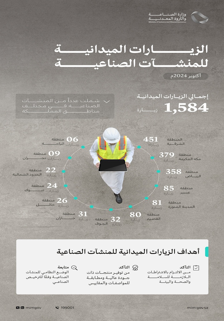 وأوضح المتحدث الرسمي لوزارة الصناعة والثروة المعدنية جراح الجراح، أنّ الزيارات الميدانية المُنفّذة خلال الشهر الماضي شملت 451 زيارة على المصانع في المنطقة الشرقية، و379 زيارة في منطقة مكة المكرمة، و358 زيارة في منطقة الرياض، إضافة إلى 85 زيارة في منطقة عسير، و81 زيارة في منطقة المدينة المنورة، و80 زيارة في منطقة القصيم، فيما نفذت 32 زيارة في منطقة الجوف، و31 زيارة في منطقة جازان، و26 زيارة في منطقة حائل، و24 زيارة على المصانع في منطقة تبوك، و22 زيارة على مصانع منطقة الحدود الشمالية، و9 زيارات على مصانع منطقة نجران، و6 زيارات في منطقة الباحة.