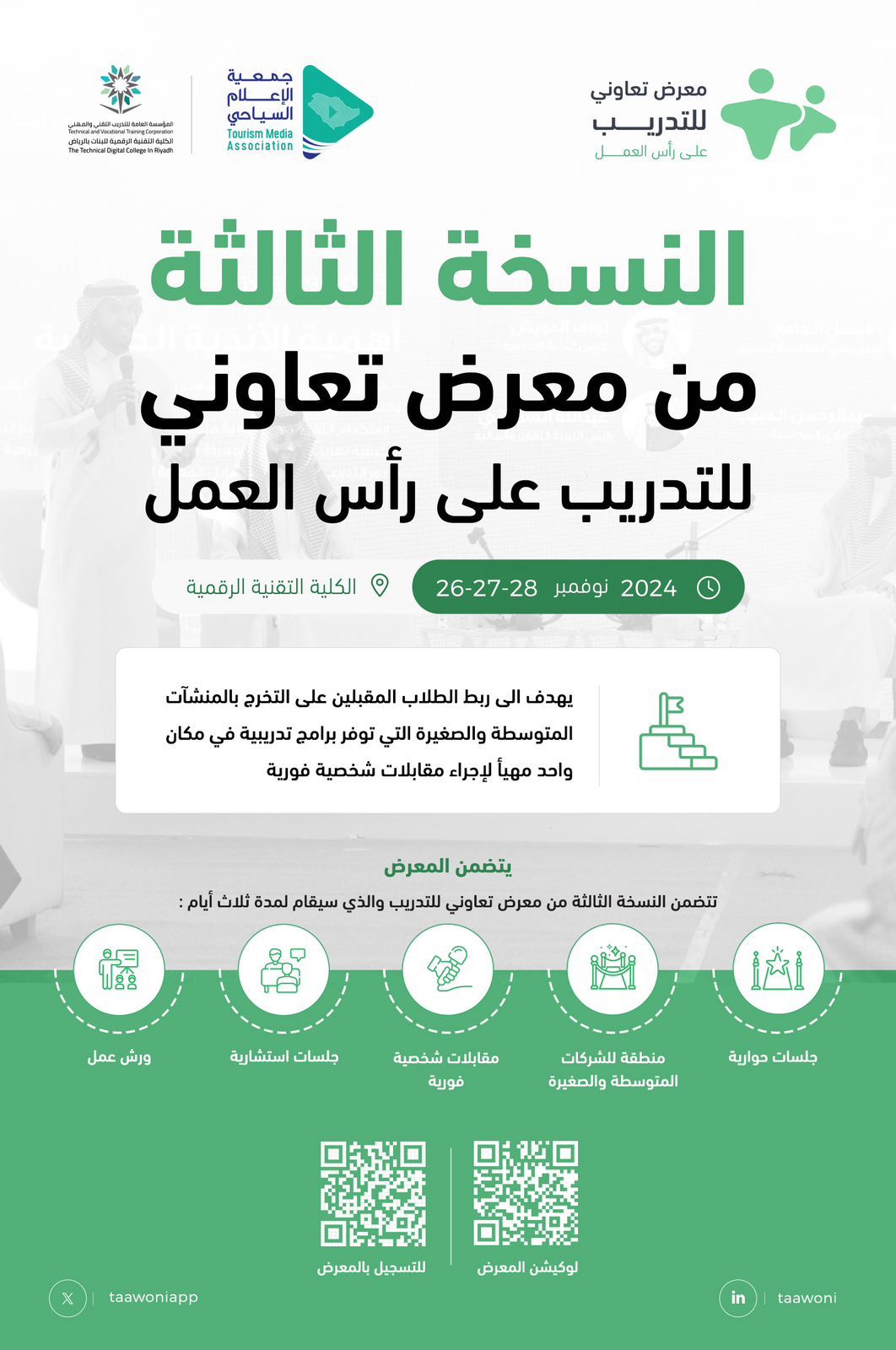 بعد نجاح النسخة الاولى والثانية من معرض تعاوني للتديب والتي كشفت عن طاقة وطموح ثروة الوطن التي تدعم مسيرة التنمية من شباب وشابات الوطن وقعت جمعية الإعلام السياحي رعاية إعلامية للنسخة الثالثه منه والتي تنطلق في الرياض الثلاثاء المقبل ولمدة ثلاثة أيام وتحدث خالد آل دغيم رئيس مجلس إدارة جمعية الإعلام السياحي عن مشاركة الجمعية وقال :