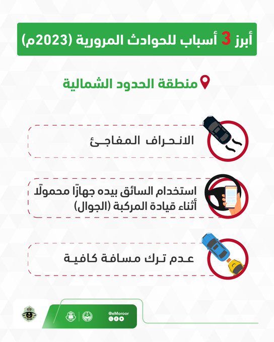 كشفت الإدارة العامة للمرور عن أبرز (3) مسببات للحوادث المرورية في عام 2023 بمنطقة الحدود الشمالية.